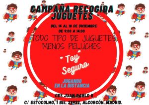 El CES JP II, acoge desde el 14 al 18 de diciembre, la “I Campaña TOY SEGURO” de recogida de juguetes nuevos, o de segunda mano, en perfecto estado, (no se aceptan peluches) para los niños de la Asociación Familia de Colores y Banco de Alimentos, de Pinto.